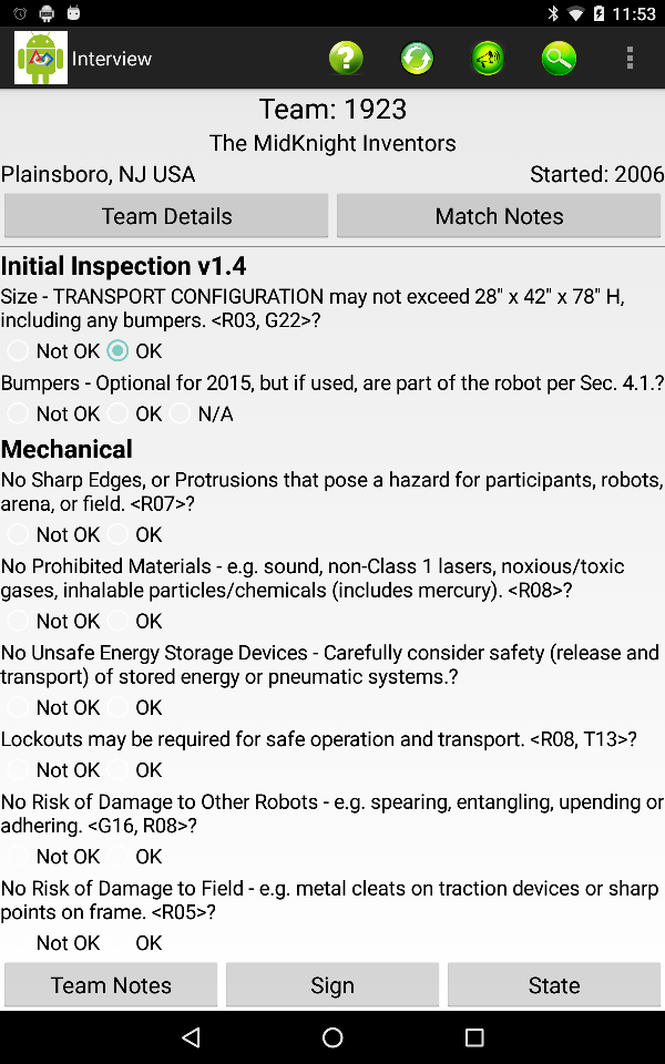 GMS brings a paperless variation to the traditional Robot Inspection process. A key benefit is that all volunteers will have up-to-date Status and Notes on all inspections. It makes the task of inspecting a lot more convenient. Additional documentation include: