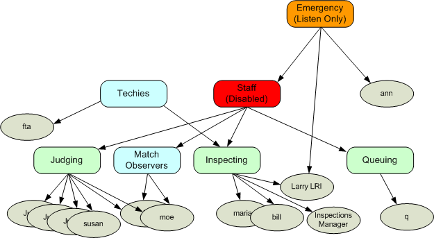Channels can be nested; each can contain sub-channels as well as users. Think of a channel as a group. In the example above, users are oval and channels are rectangles. The "Techies" channel contains the user 'fta' and the sub-channel "Inspecting". The "Inspecting" channel contains a bunch of Robot Inspectors, LRIs and IMs. The "Staff" channel contains Judging, Inspecting, etc.