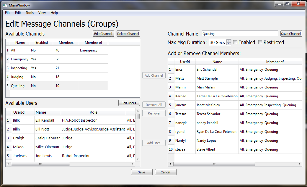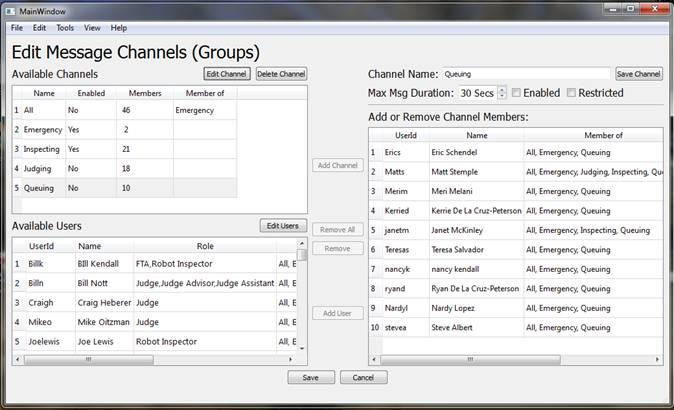 Channels can be added, deleted or modified on the server via View ŕ Channels. Compose channel membership (users and sub-channels) in the table to the right. The available channels and users are listed on the left.