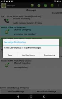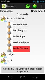 The Channels screen allows the selection of a target recipient for subsequent messages. It displays channels that are authorized for the user. A channel can be expanded by long pressing on it. Select a channel or a specific user. Selecting a channel will broadcast the message to the entire channel while selecting an individual will send the message to that specific person. You cannot select yourself. Also, you cannot select a Restricted or Disabled channel.