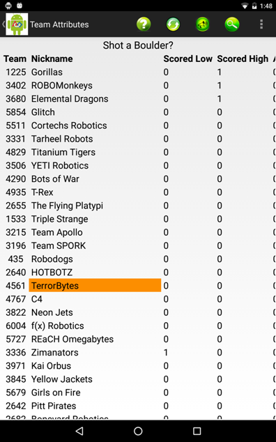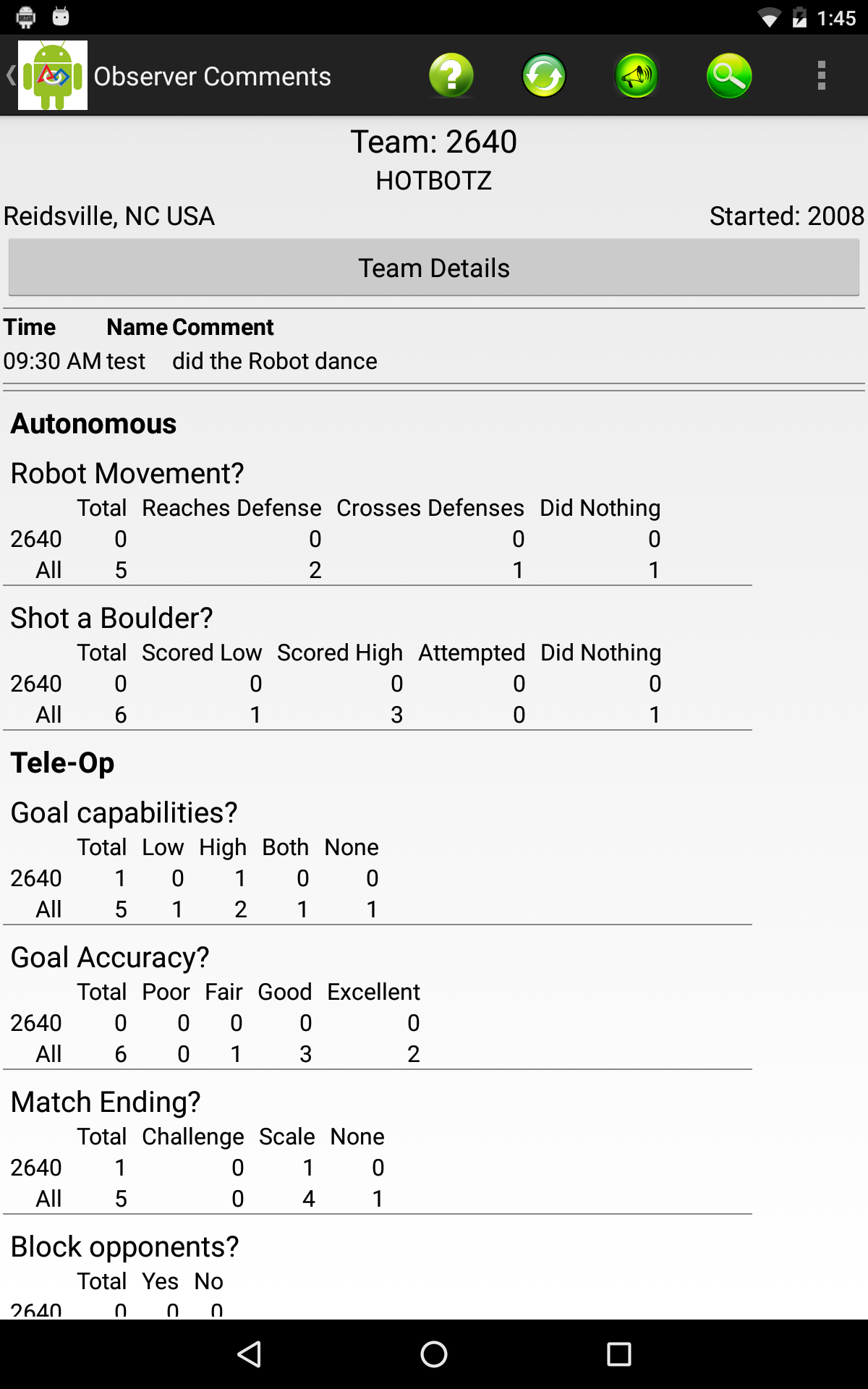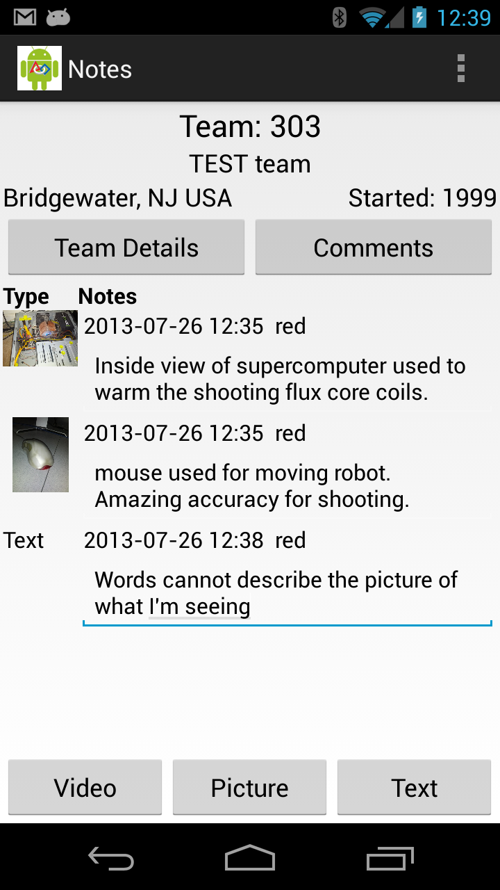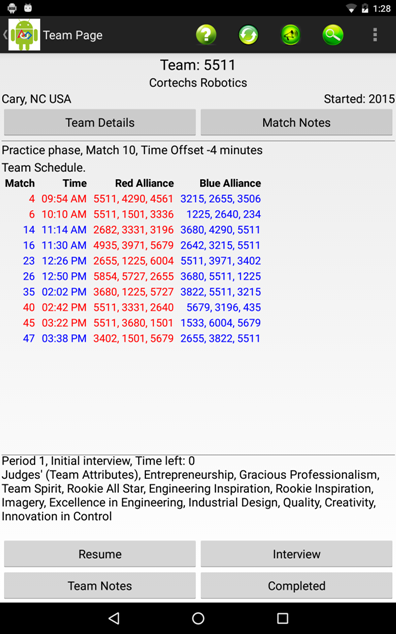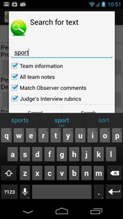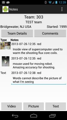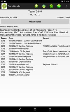 Team Information includes the team number, nickname, sponsors, location motto and award history. Selecting notes will search notes for all teams. The search results will indicate the team, field that matched and the context of the matched terms. Touching a row in the search result will take you to the team.