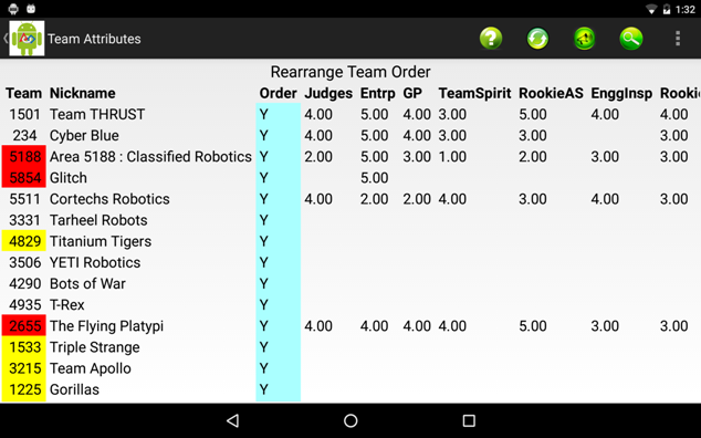 Swiping your finger vertically on the Pit Map displays a Column view of the teams. This view allows sorting by columns.