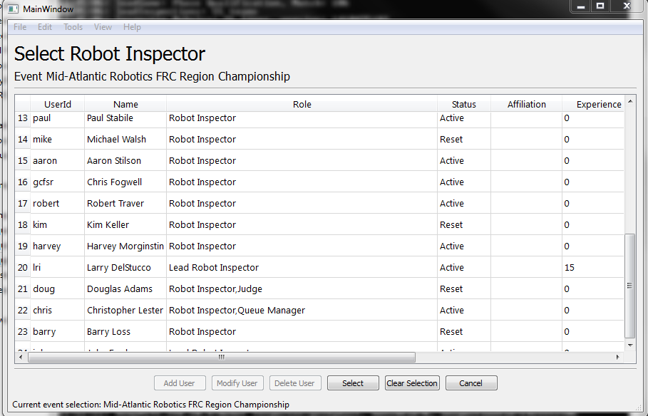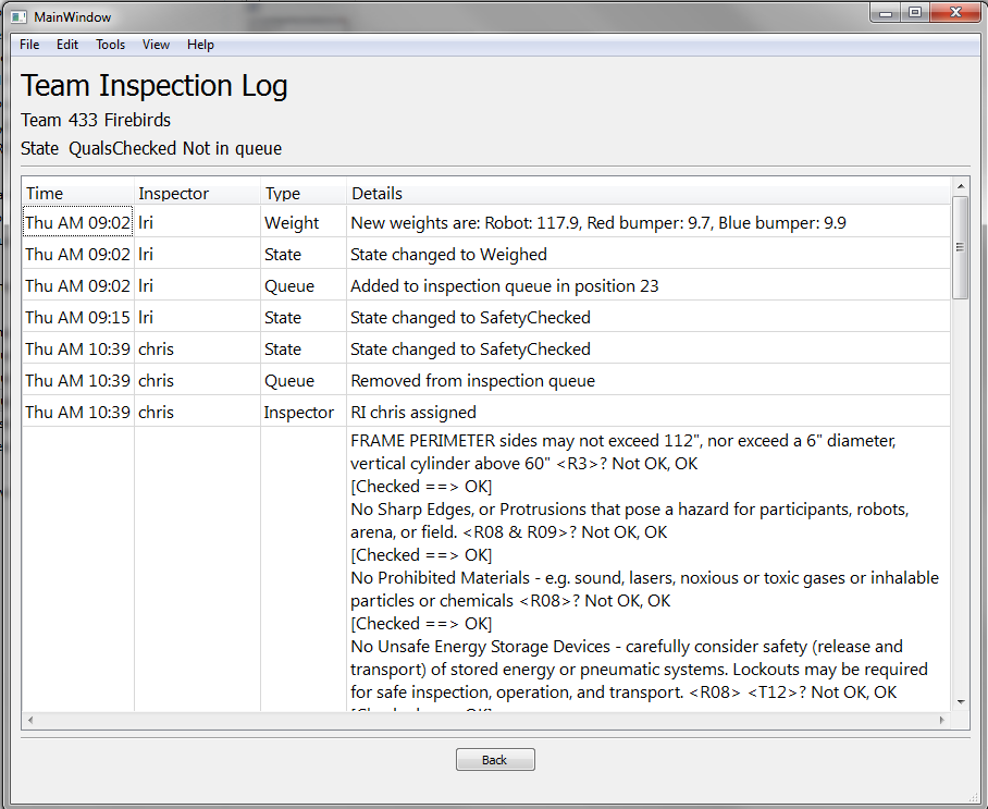 The inspection log tracks all changes made to the team status. The userId of the RI who made the changes and the time it was made will be saved. Changes in robot weight are also recorded. This allows the LRI to track down each RI that was associated with a team’s inspection when there is a question about variances granted to a team.