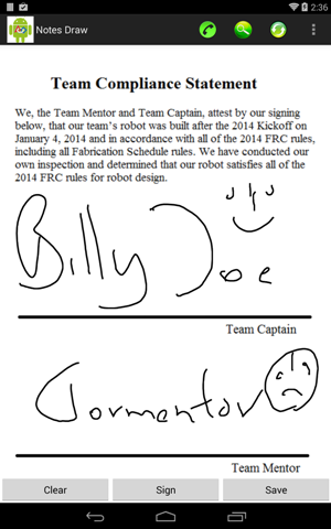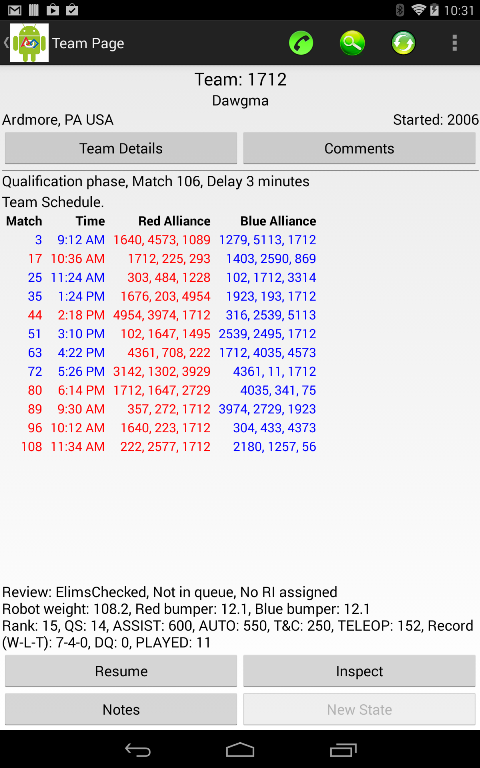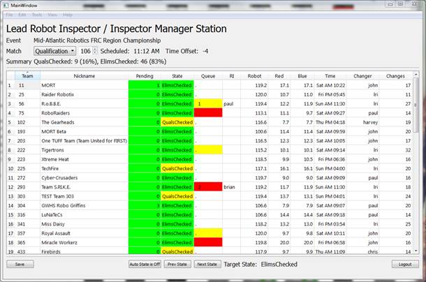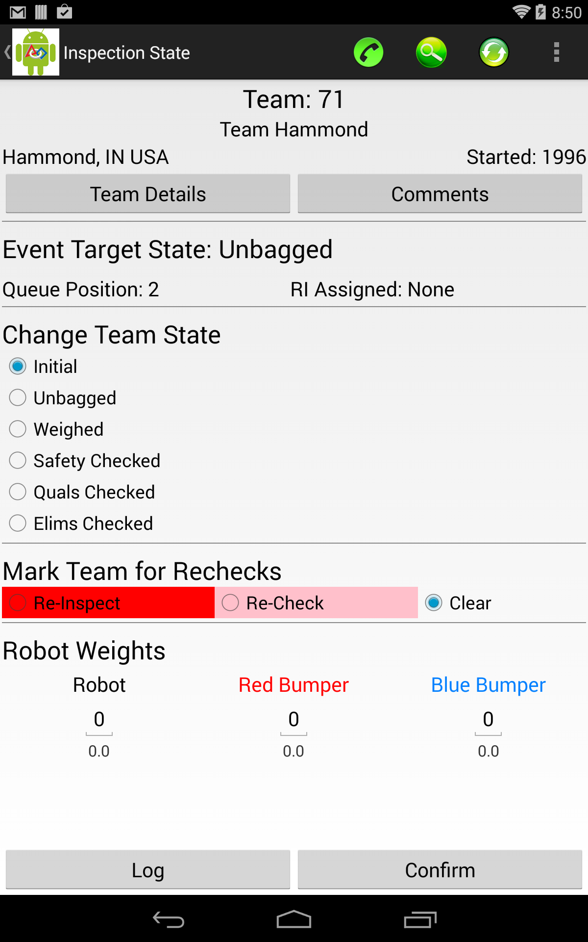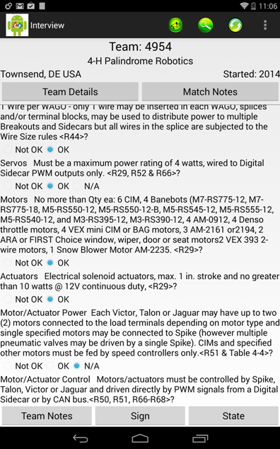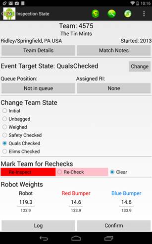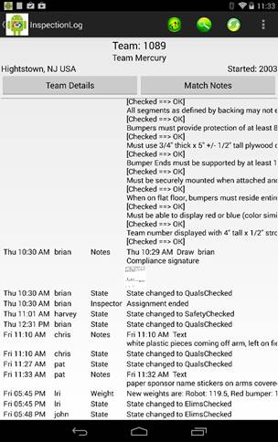 This screen allows RIs to check off items as they inspect a robot. Checking off an item will broadcast the change to all others. The next RI inspecting the team can resume where the previous RI left off. This helps provide a consistent front to the teams.