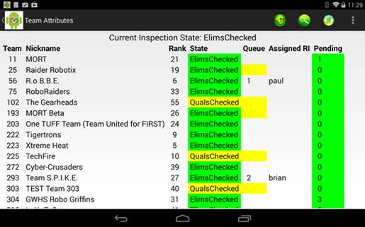 Swiping the pit map vertically displays a tabular view of the teams. This view allows teams to be sorted according to different columns. For example, sorting by Rank allows the top few teams to be selected for re-inspection just before the Elimination rounds.