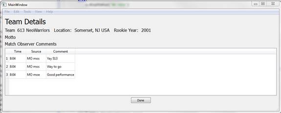 Clicking on a team number in the PC home screen displays team details which includes all the Match Observer notes for that team. A sample of the Team Details screen on the laptop is shown below.