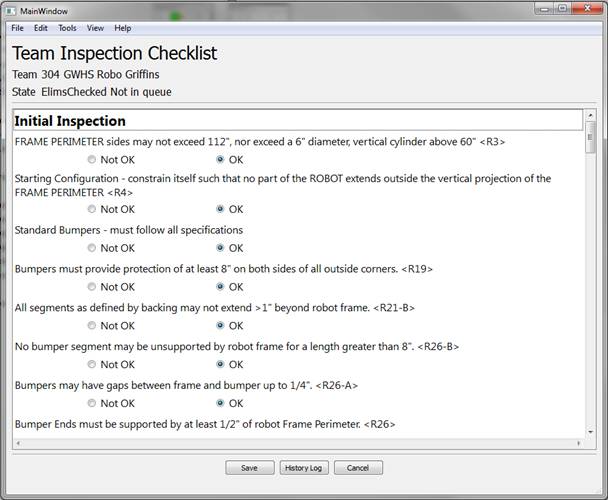 The questions in the Robot Inspection Checklist are based on the paper checklist. They can be left unanswered, or can be answered OK or not OK. Each team may have a checklist in a different state of completion.