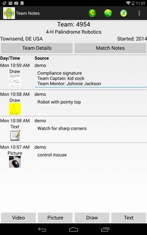 The Notes screen allows notes to be added to the team’s log. Notes can be text, video, picture or a drawing. They can be annotated. Pictures and drawings can be drawn over, so that things of interest can be marked or circled.