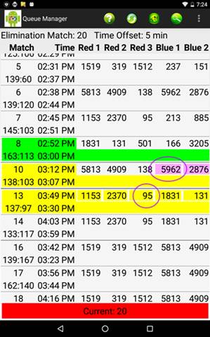 Swiping a pit map horizontally changes the view to indicate when teams are expected to queue for the field. This changes the color coding. Red means that the team is on the field, yellow means that they are queuing. Swiping horizontally again changes the "current" match number. Pressing the back button returns to Inspection status view.