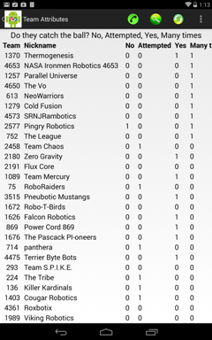 Pit scouting information is summarized on the "Team List" page. Each team is listed as a row. There is a column for each Pit rubric. The column can be sorted by touching the column header.