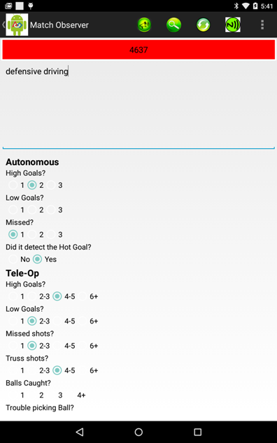 Match scouts can review and edit comments on previous matches by clicking on the Previous or Next button. Touch the large button labeled "Start Observing" to start entering comments. This will display the data entry screen for 6 teams and the Match. Pages for other teams come into view when the screen is swiped sideways. Alternatively, long press on a team and select "Observe Team". This allows only one team to be observed. Long pressing the "Start Observing" button allows you to enter observations on the match.