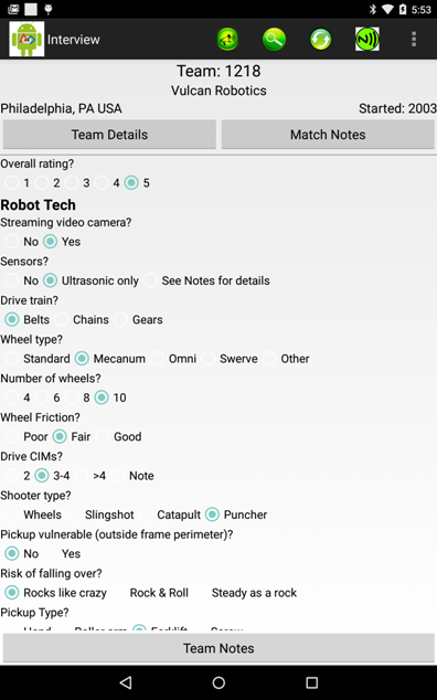 Pit scouting allows team members to gather information about a team and their robot. It uses a different set of customizable rubrics. Click on the Interview button on the team page to start the Pit Interview. Clicking on the Resume button displays only the unanswered rubrics.