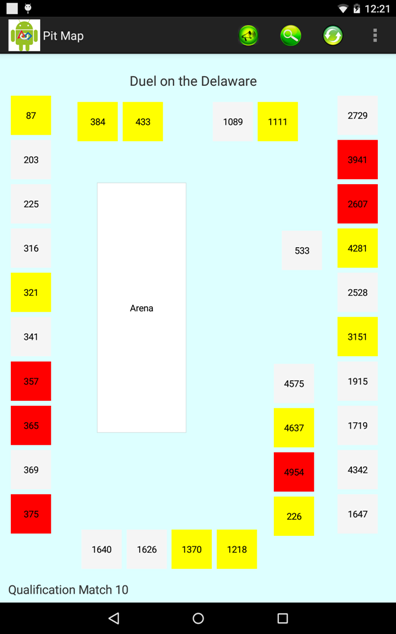 A Pit map will be available if the event publishes it. The teams will be color coded to indicate whether the team is on the field (Red), queuing (Yellow), or if it is on the personal list (Orange). When the Match schedule is available, swiping the pit map horizontally changes the displayed match number and the teams that are being queued. Swiping to the right increases the match number and swiping to the left reduces it. Have fun. Try long pressing on a team.