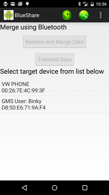 This function is similar to Syncing with Beam, but the steps are different. The sender and receiver must have Bluetooth capability. Both parties must be logged in into GMS and must click the "Share" icon to get to the Bluetooth Share screen. The receiver should first click on the Receive button and enable Bluetooth visibility. The sender should then click Transmit. After a few seconds, the available receivers will be displayed to the transmitter. The receiving device will display its name and address. Wait for the target receiver to appear and select it. Verify the MAC addresses. Both parties may now need to verify Bluetooth pairing. Lastly, the receiver must click a button to accept data from the transmitter. The "Terse / Expert" setting is used as in Beam.