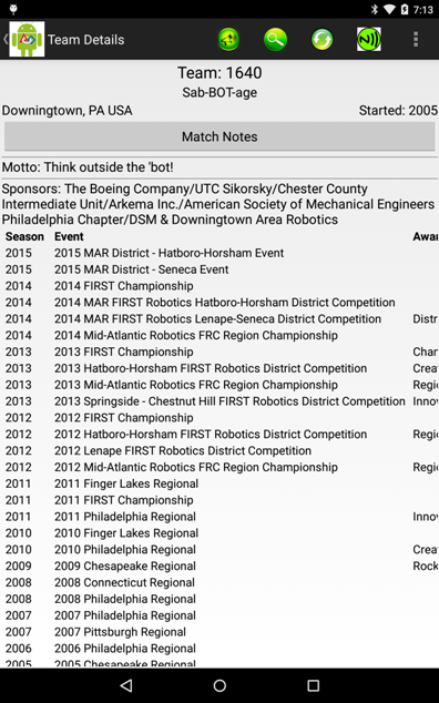 Clicking on a team button displays the Team Page. This screen summarizes information about the selected team which may be useful while preparing to interview them. Additional award history is available by clicking on Details button. Private notes on each team can be entered and viewed on the Team Notes page. Click on the Match Notes button to see all available match comments made on a specific team.