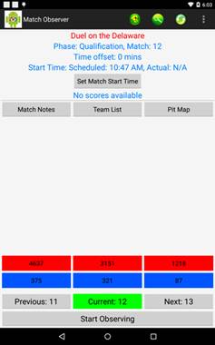 The Match scouting page displays the current match and the team alliances that will be competing. The alliances and schedules will be pre-configured by the procedure described in the Setup section.
