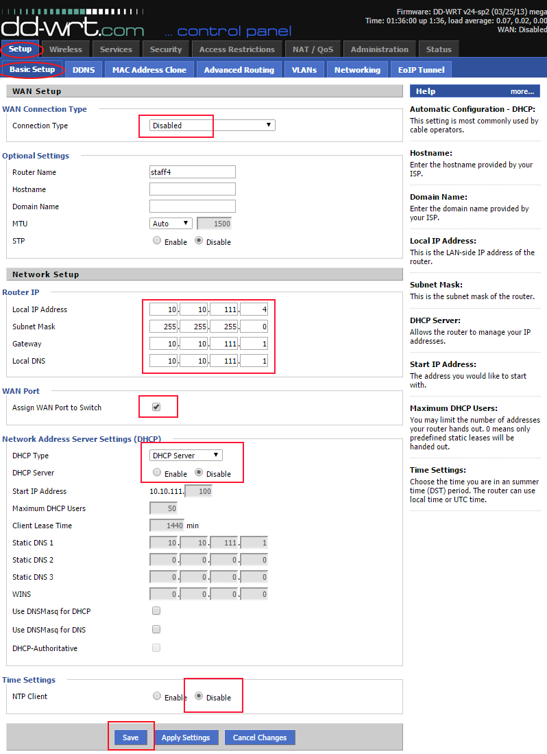 · Enable DHCP Server: Unchecked (Press Save Settings)