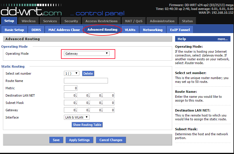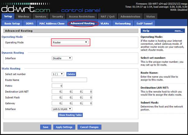 2. Next click on Advanced Routing. Click Save when this screen is filled out. Note that the Operating mode is "Router" and not "Gateway".