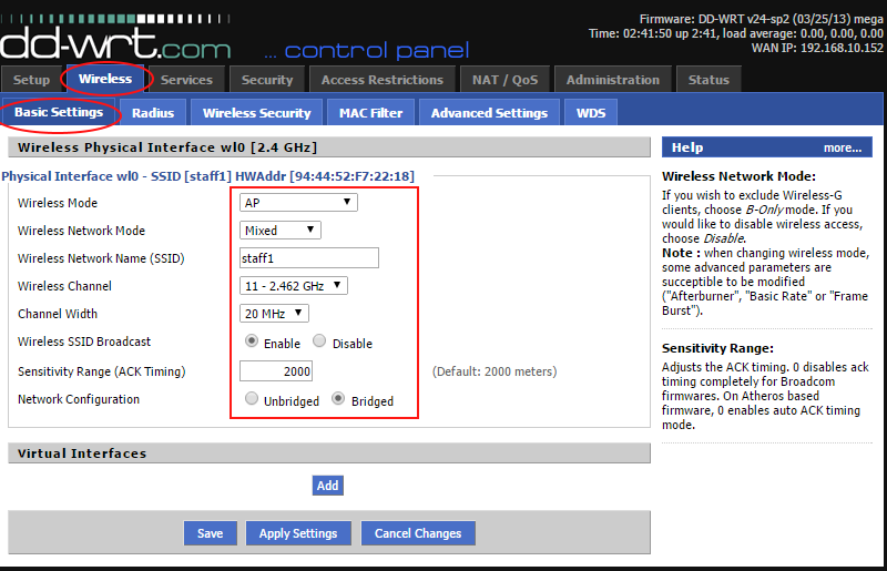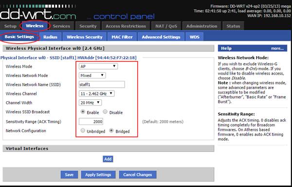 3. Click on Wireless, then Basic settings. Click Save when this screen is filled out.