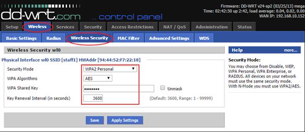 4. Click on Wireless Security. Click Save when this screen is filled out. Then click Apply Settings. Wait for screen to refresh.